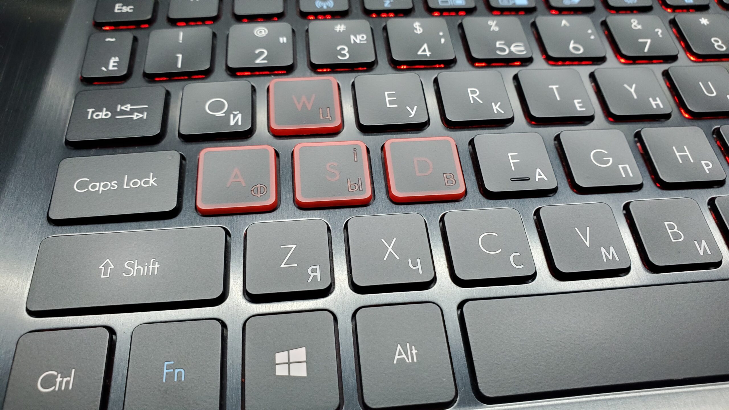 Клавіатура з українськими та російськими літерами та червоним підсвічуванням.