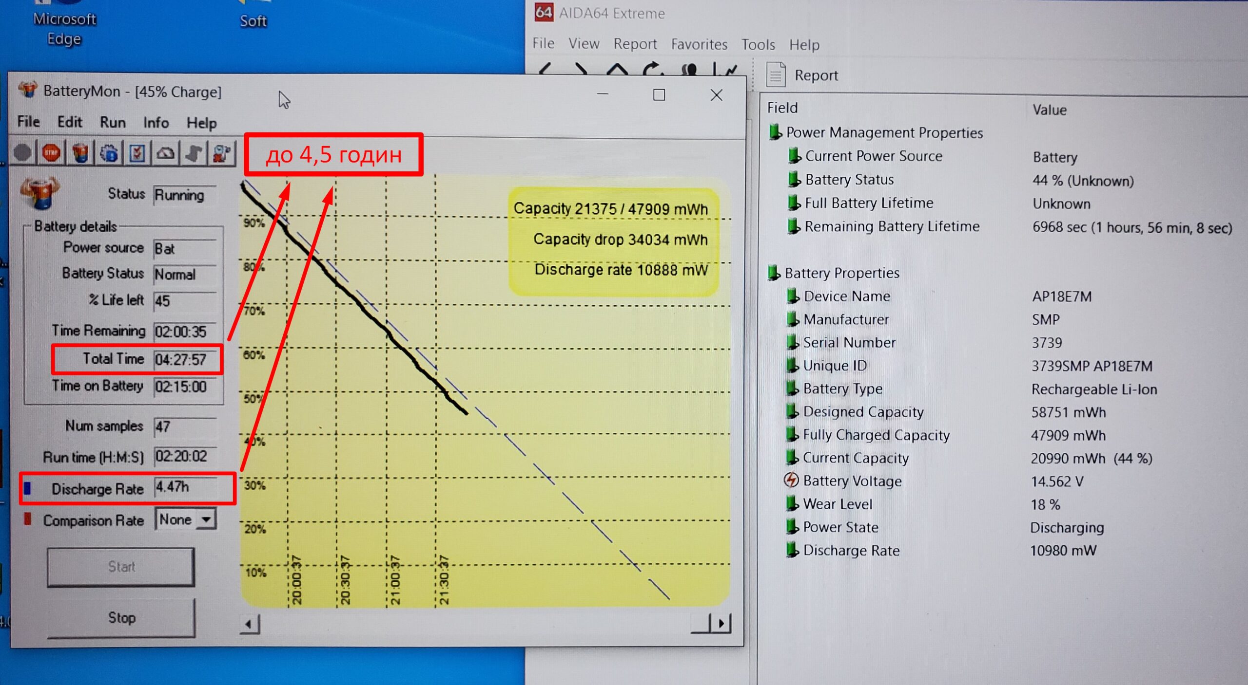 Час роботи від батареї біля 4,5 годин годин в режимі перегляду фільмів (див. фото).