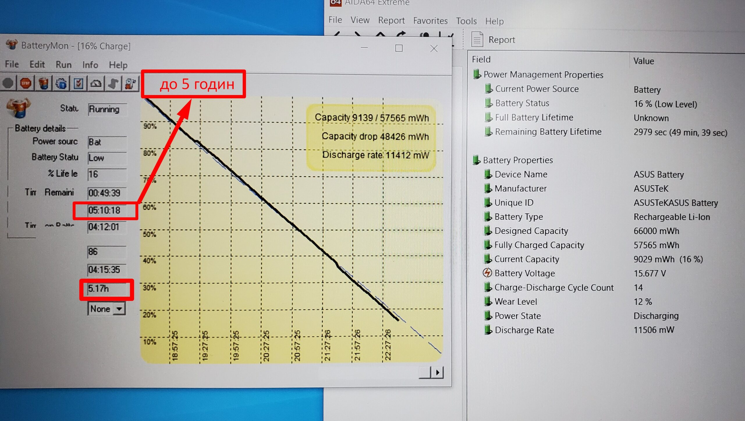 Час роботи від батареї більше 5 годин в режимі перегляду фільмів (див. фото).