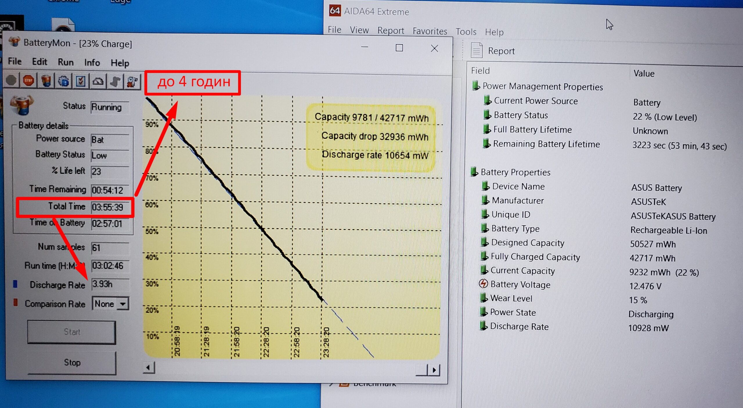 Час роботи від батареї до 4 годин в режимі перегляду фільмів (див. фото).