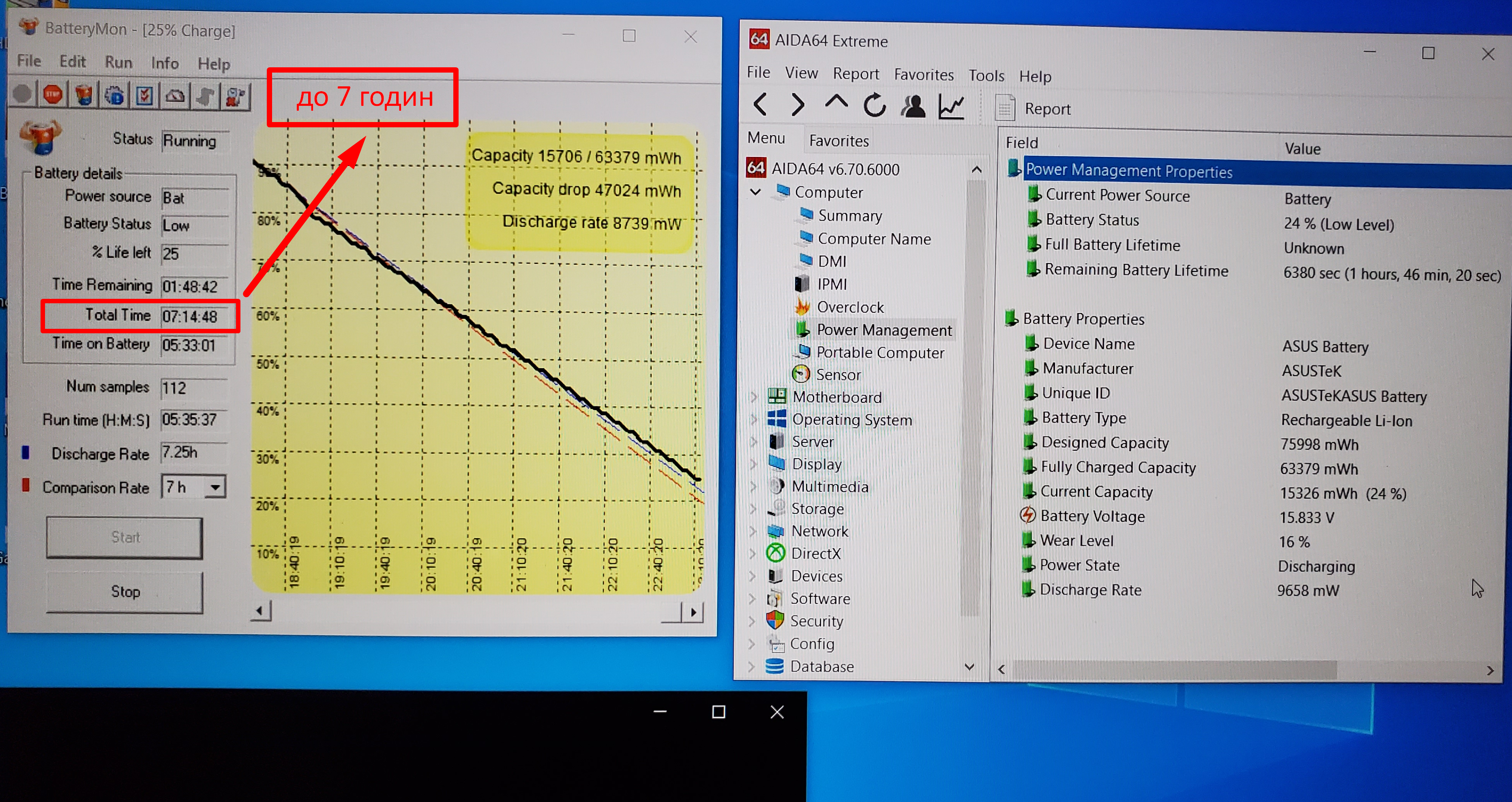 Час роботи від батареї близько 7 годин! в режимі перегляду фільмів (див. фото).