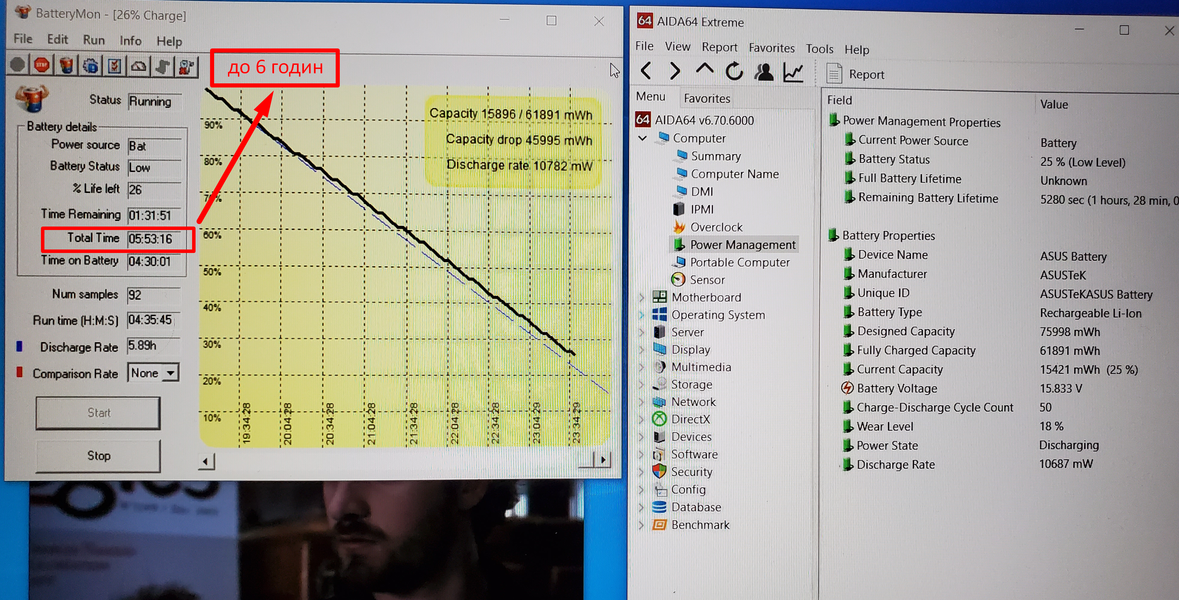 Час роботи від батареї біля 6 годин в режимі перегляду фільмів (див. фото).