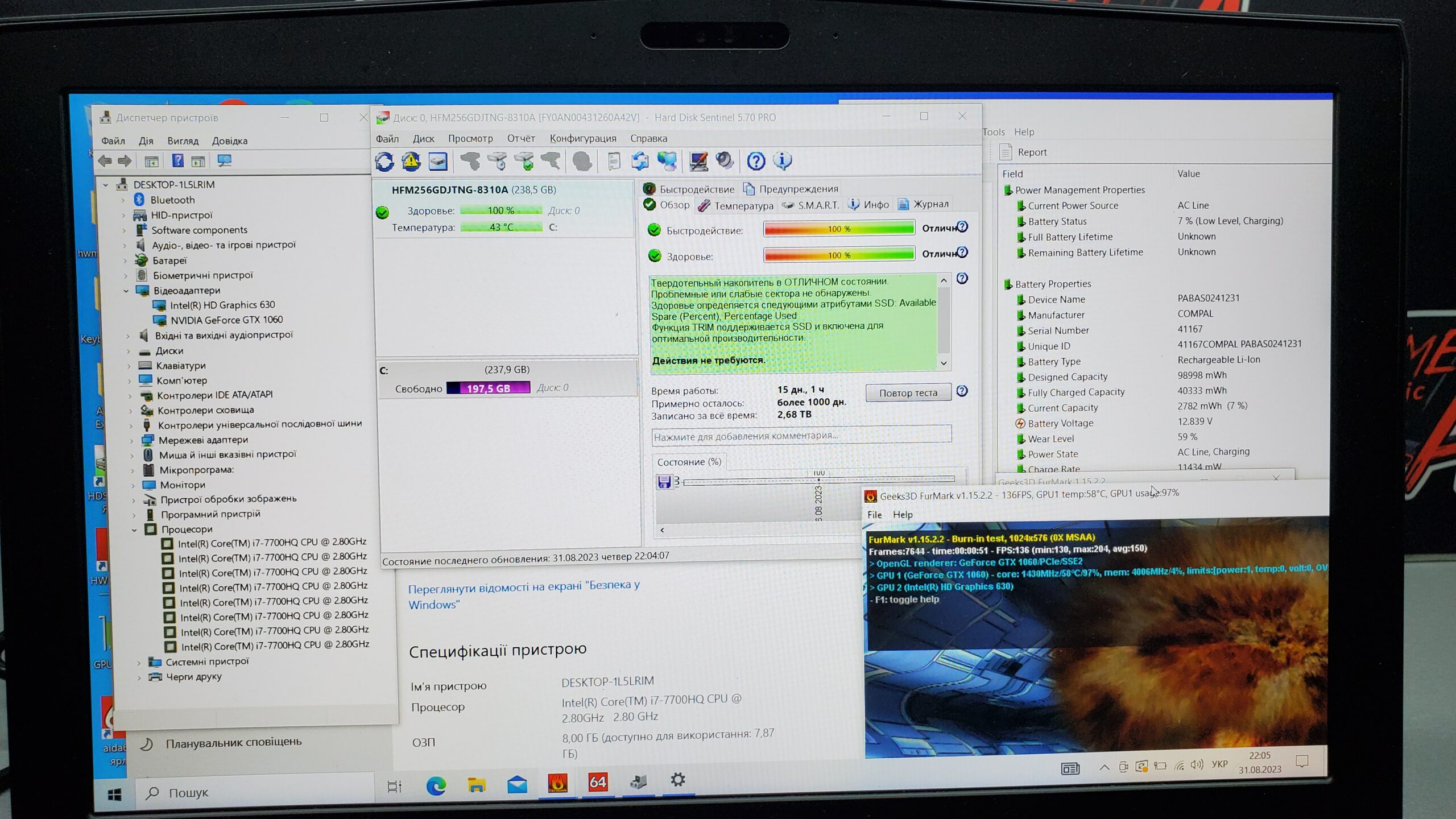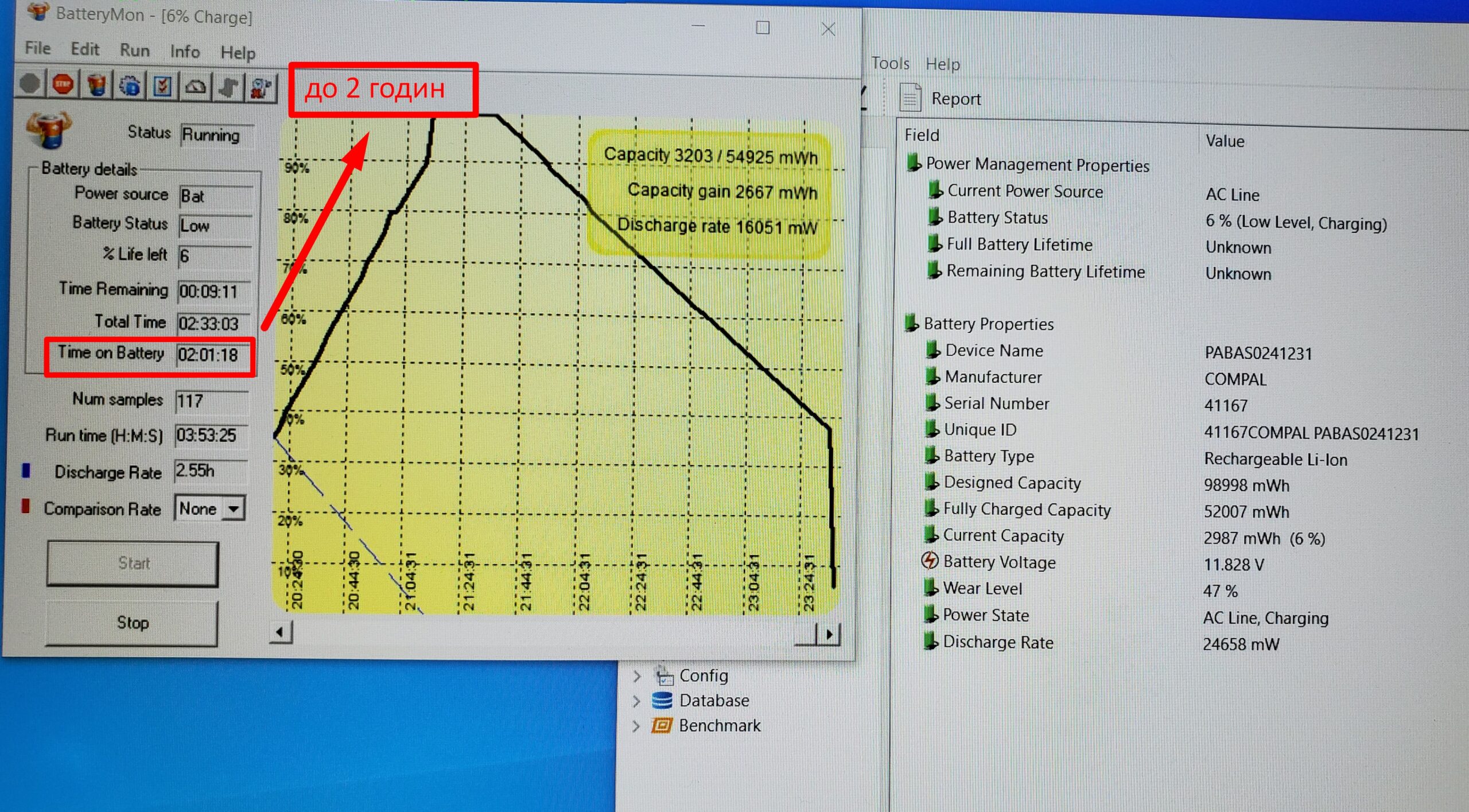Батарея має суттєвий знос біля 50%, але при цьому ноутбук в режимі перегляду фільмів працює біля 1,5 годин (див. фото).