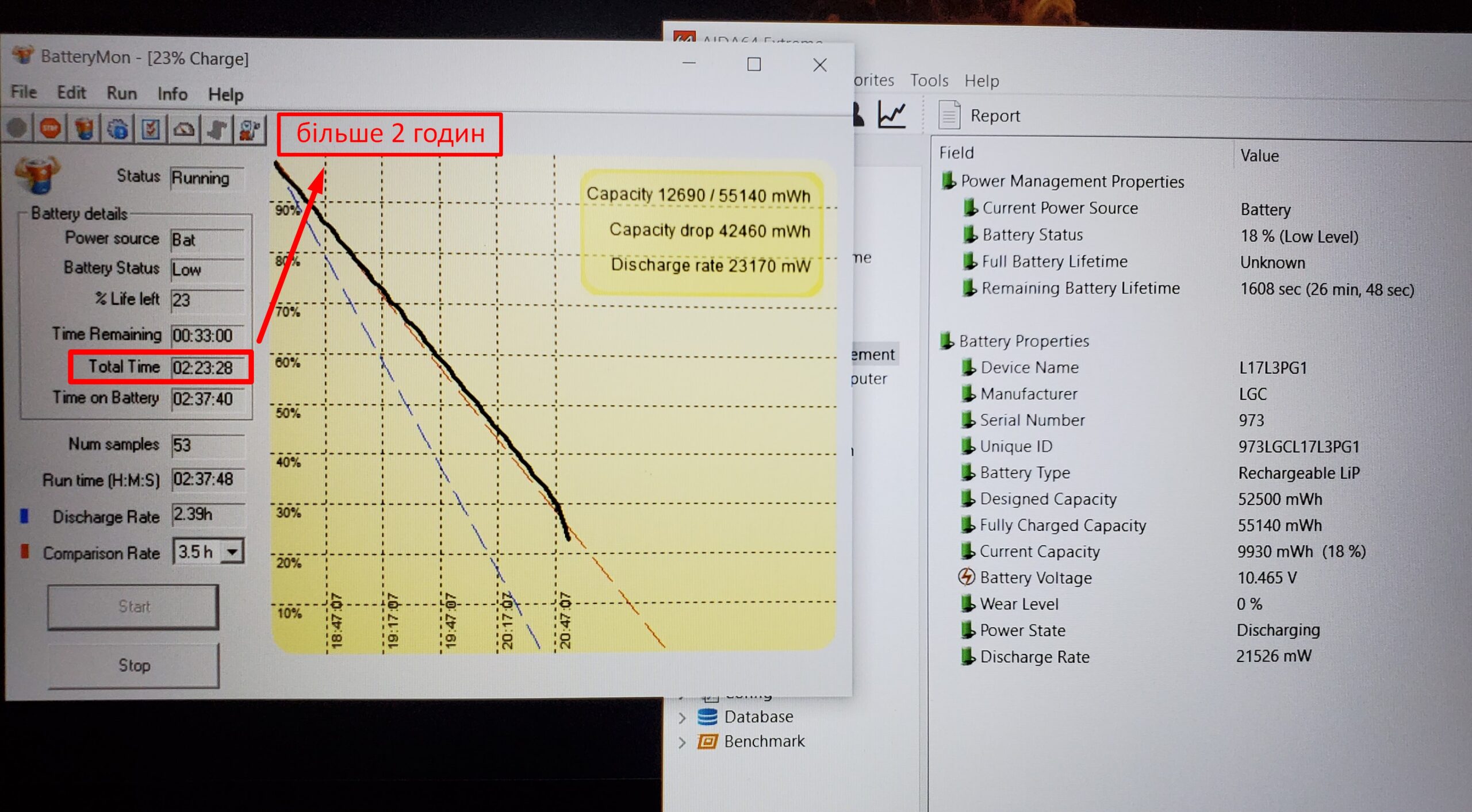 В продажу бюджетна, проте ще дуже актуальна модель ноутбука Lenovo Legion Y530 у вживаному стані, на повноцінному процесорі Intel Core i7-8750H з часом роботи від аккумулятора більше 2 годин в режимі перегляду фільма (див. скріншот).