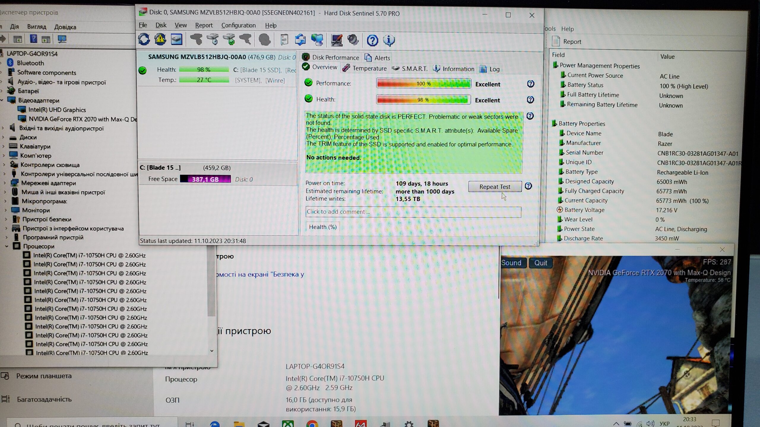 В продажу культовий ігровий ноутбук американської торгової марки Razer в гарному стані, з невеликими слідами використання та некритичним пошкодженням кута корпусу, на повноцінному сучасному процесорі Intel Core i7-10750H.