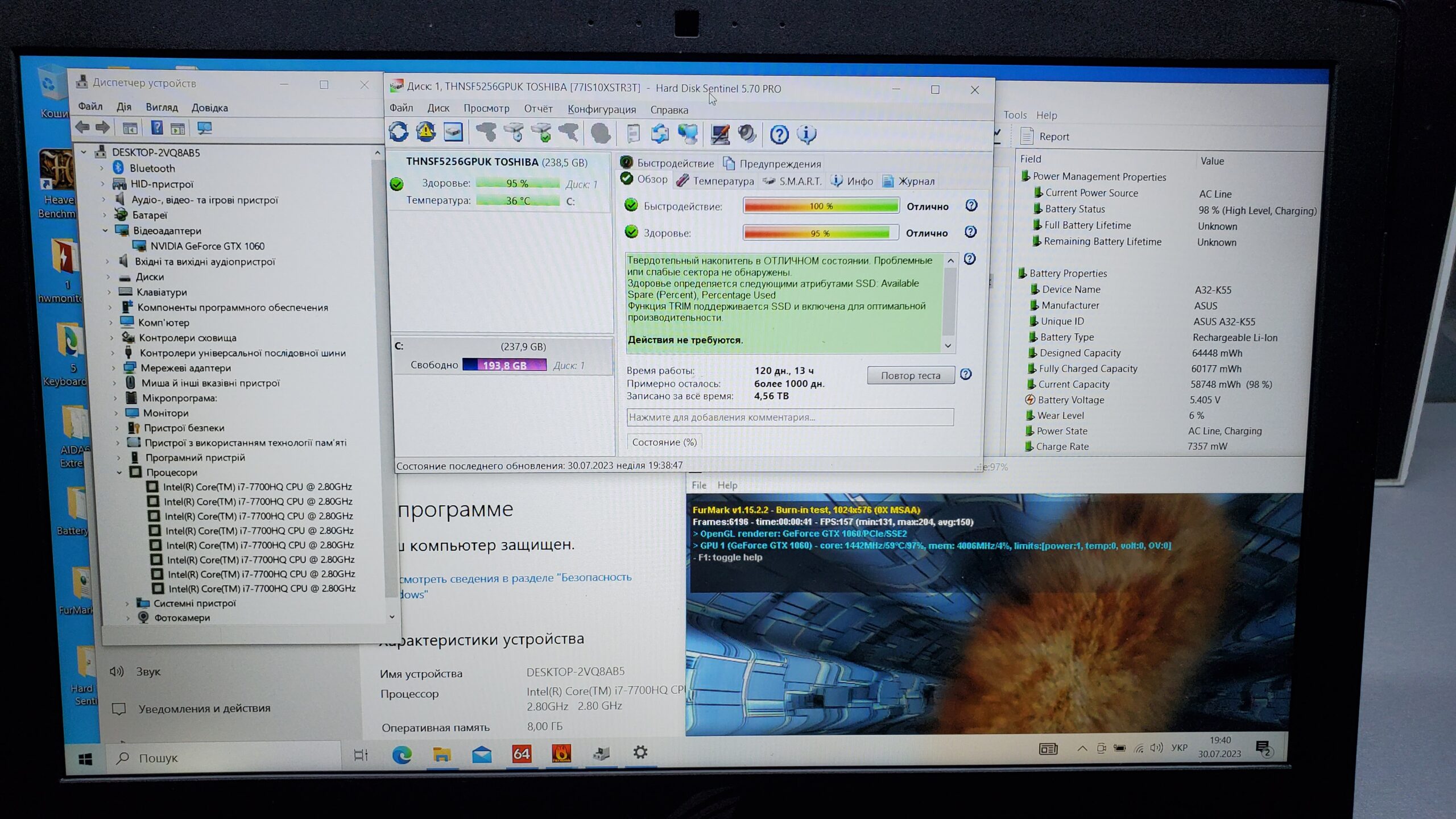 Ноутбук приехал в состоянии со следами использования (подклеенная рамка) и нуждался в мелком ремонте платы — удалении одного мелкого замкнутого конденсатора. Так что можно сказать, что материнская плата без ремонтов. Все работы выполнены как обычно на самом высоком уровне качества без дальнейшего воздействия на работоспособность ноутбука. Установлены новые вентиляторы. Естественно, была сделана и полная профилактика, замена термопасты и удаление пыли и особая сборка системы охлаждения с нашими доработками для улучшения ее эффективности. Оттестирован и готов к любым проверкам и задачам. Клавиатура с украинскими и русскими буквами и разноцветной подсветкой. |