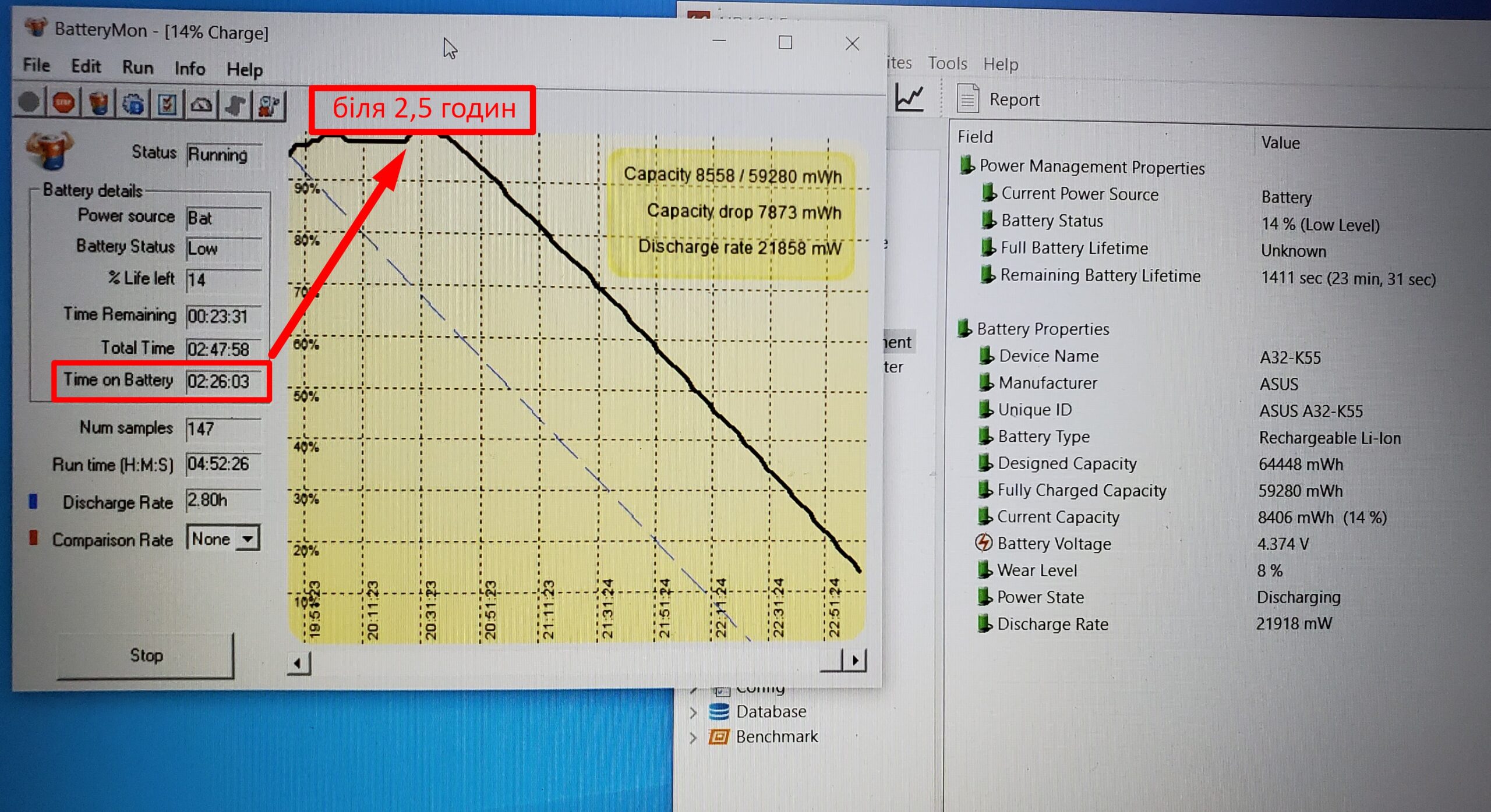 Время работы от батареи около 2,5 часов в режиме просмотра фильмов (см. фото).