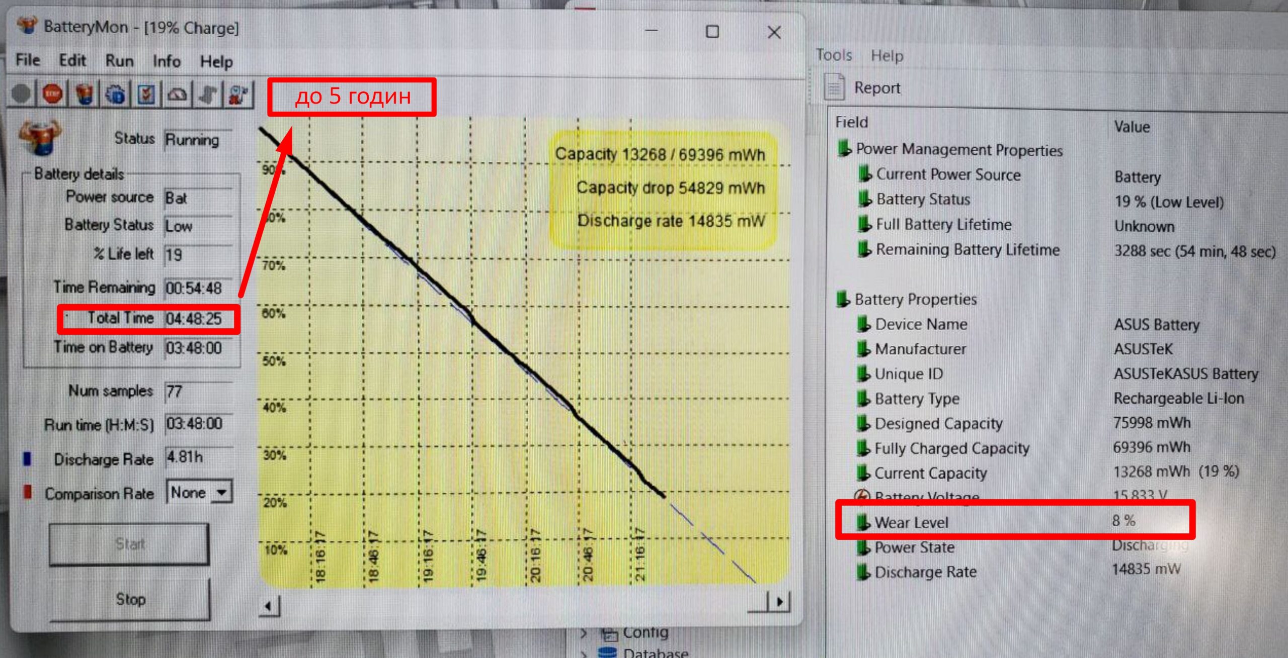 Время работы от батареи около 5 часов в режиме просмотра фильмов (см. фото).