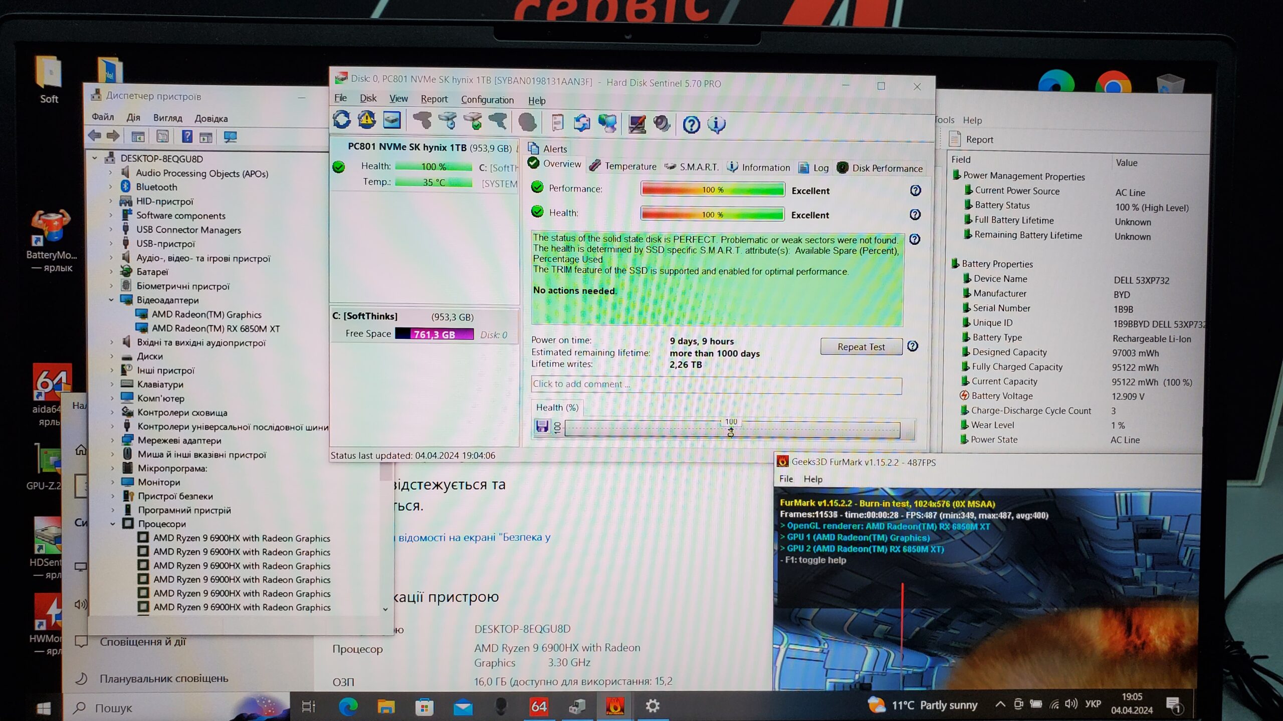 Комфортный для работы 16Гб объем оперативной памяти DDR5! (8+8Gb в двухканальном режиме, дающий еще дополнительные 15% производительности) и новый диск SSD m2 NVMe SK Hynix PC801 на 1Tb с самым быстрым интерфейсом PCI Express.