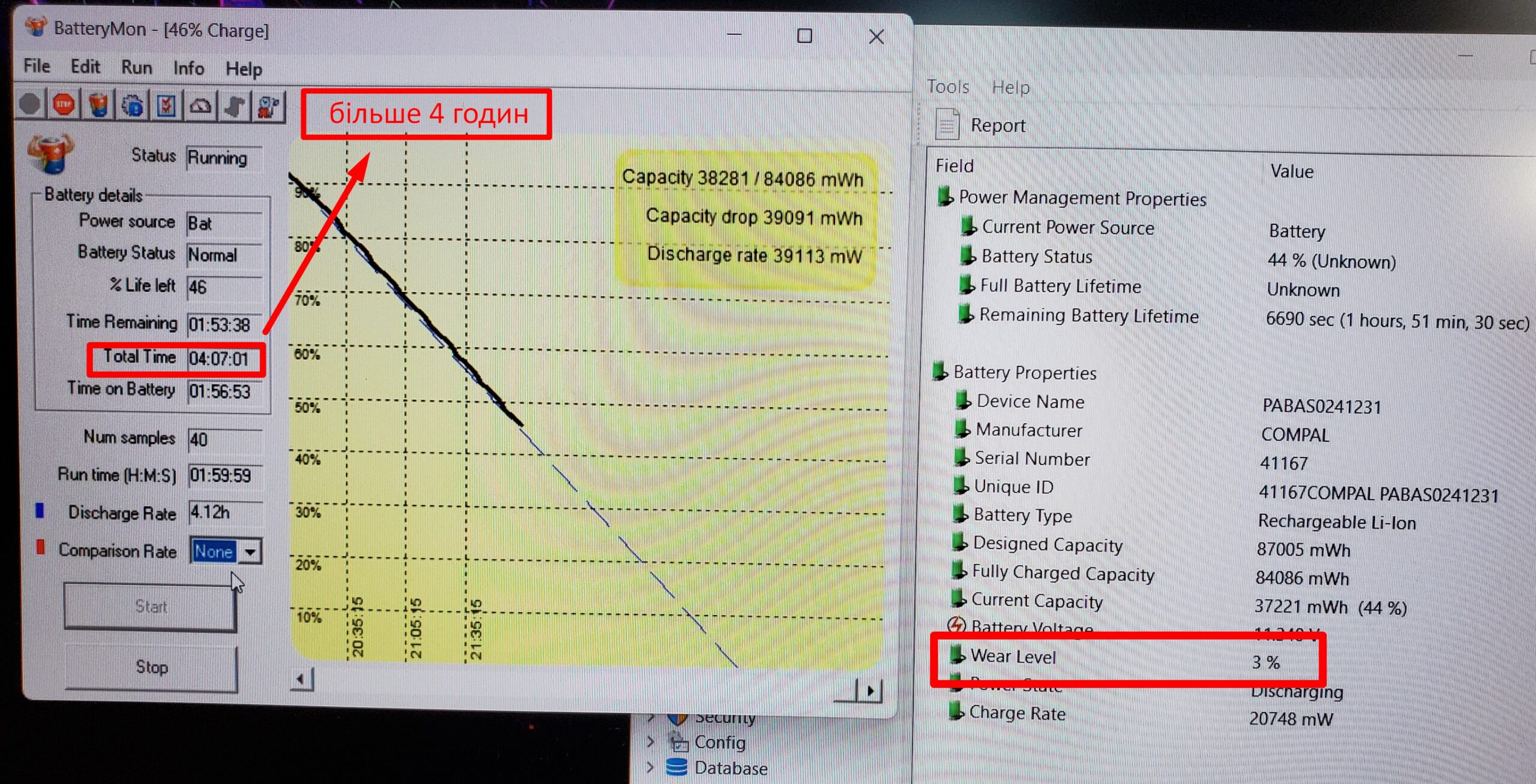 Время работы от батареи около 4 часов в режиме просмотра фильмов (см. фото).