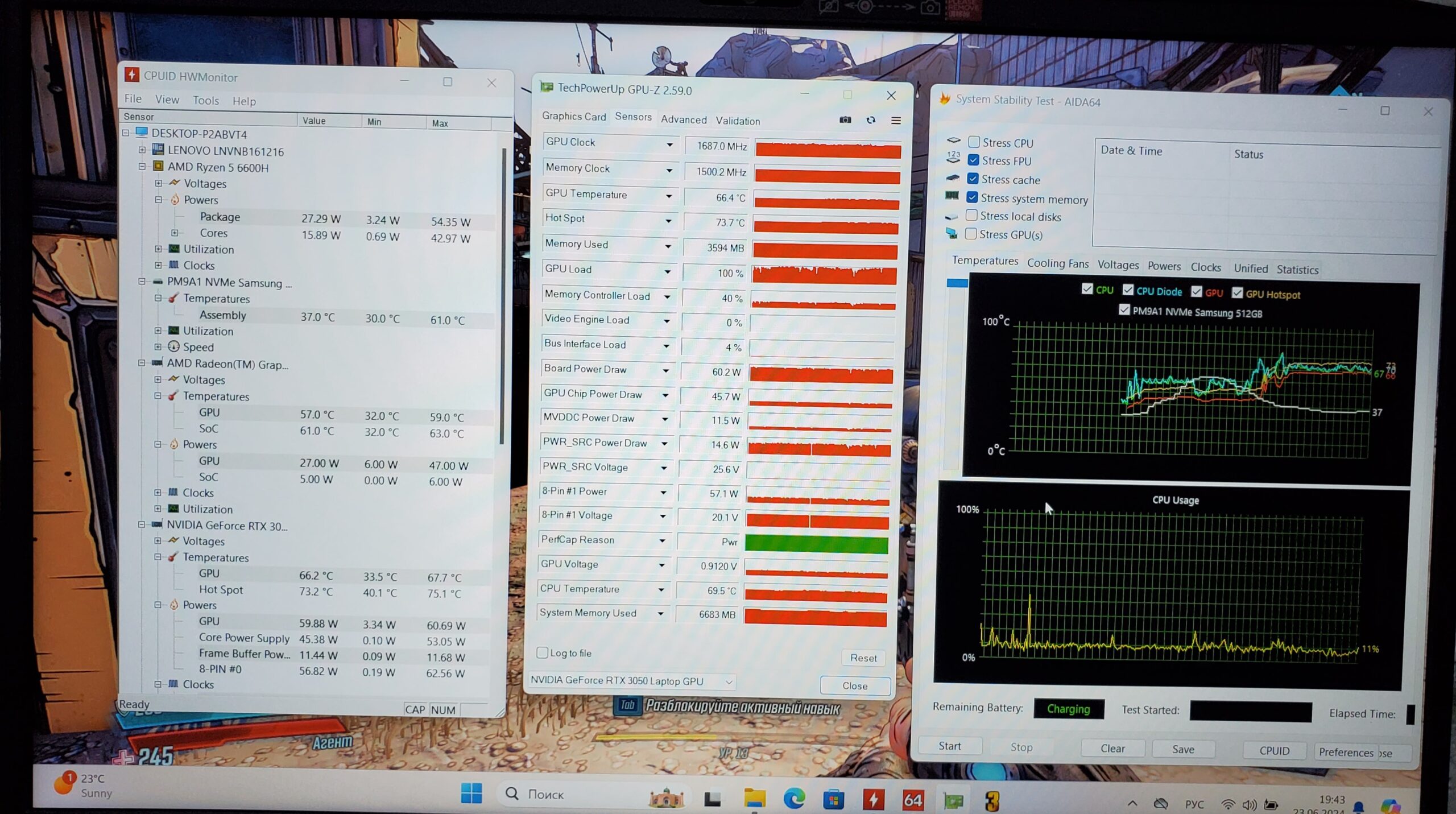 В продаже ноутбук от Lenovo серии Ideapad в состоянии б/у, следы использования (потертости, немного царапин), на полноценном мощном процессоре AMD Ryzen 5 6600H со временем работы от аккумулятора до 4 часов в режиме просмотра фильма (см. скриншот).