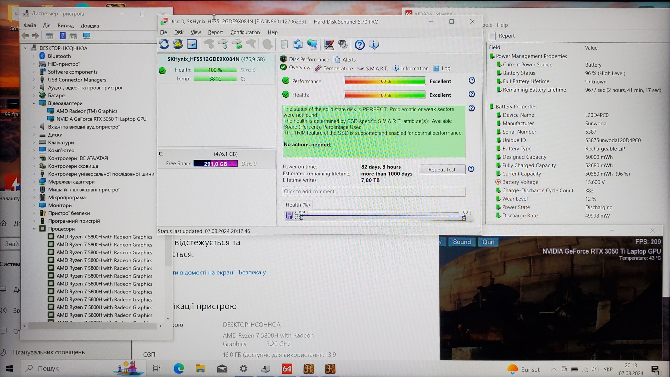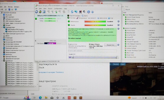 В продаже ноутбук от Lenovo серии Legion удачной конструкции с эффективной системой охлаждения в состоянии б/у, следы использования (потертости, немного царапин), на полноценном мощном процессоре AMD Ryzen 7 5800H со временем работы от аккумулятора около 4 часов в режиме просмотра фильма (см. скриншот).