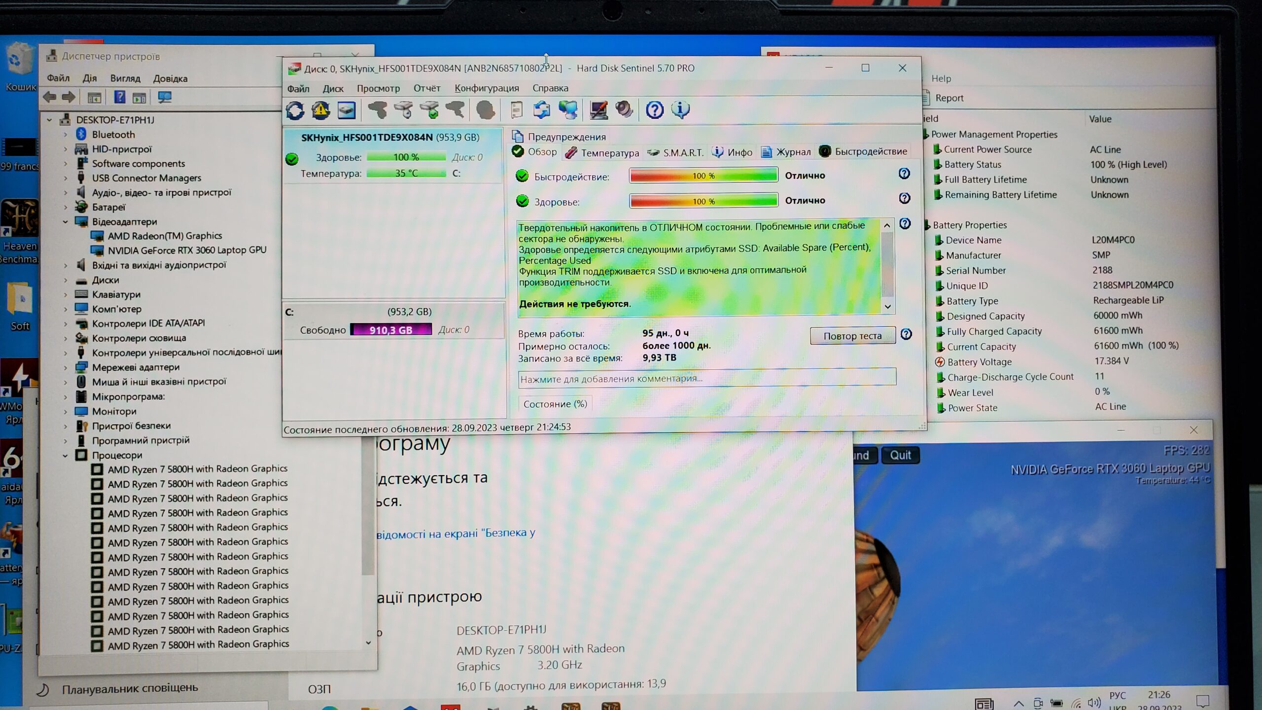 Ноутбук приехал в хорошем состоянии, нуждался лишь в мелком ремонте цепей заряда батареи. Других ремонтов на плате нет. Была сделана полная профилактика, установлен быстрый диск ССД и операционная система с драйверами. Производительность процессора больше чем у 10 поколения Интелла i7! Видеокарта по производительности приближена к RTX 2070 с 8Гб видеопамяти, но со значительно меньшим нагревом! Очень удобная клавиатура, удачная конструкция корпуса и системы охлаждения без перегрева! Оттестирован и готов к любым проверкам и задачам. Клавиатура с украинскими и русскими буквами и разноцветной программируемой подсветкой. На корпусе присутствуют царапины, на экране есть потертости от клавиатуры и два маленьких засвета, которые не будут привлекать внимания в использовании (см. фото, левого вообще не разглядеть, правый находится у самого края экрана и он тоже виден в основном только на белом фоне) . Гарантия на весь ноутбук 6 месяцев! и индивидуальное обслуживание и ремонт по истечении гарантийного срока. |