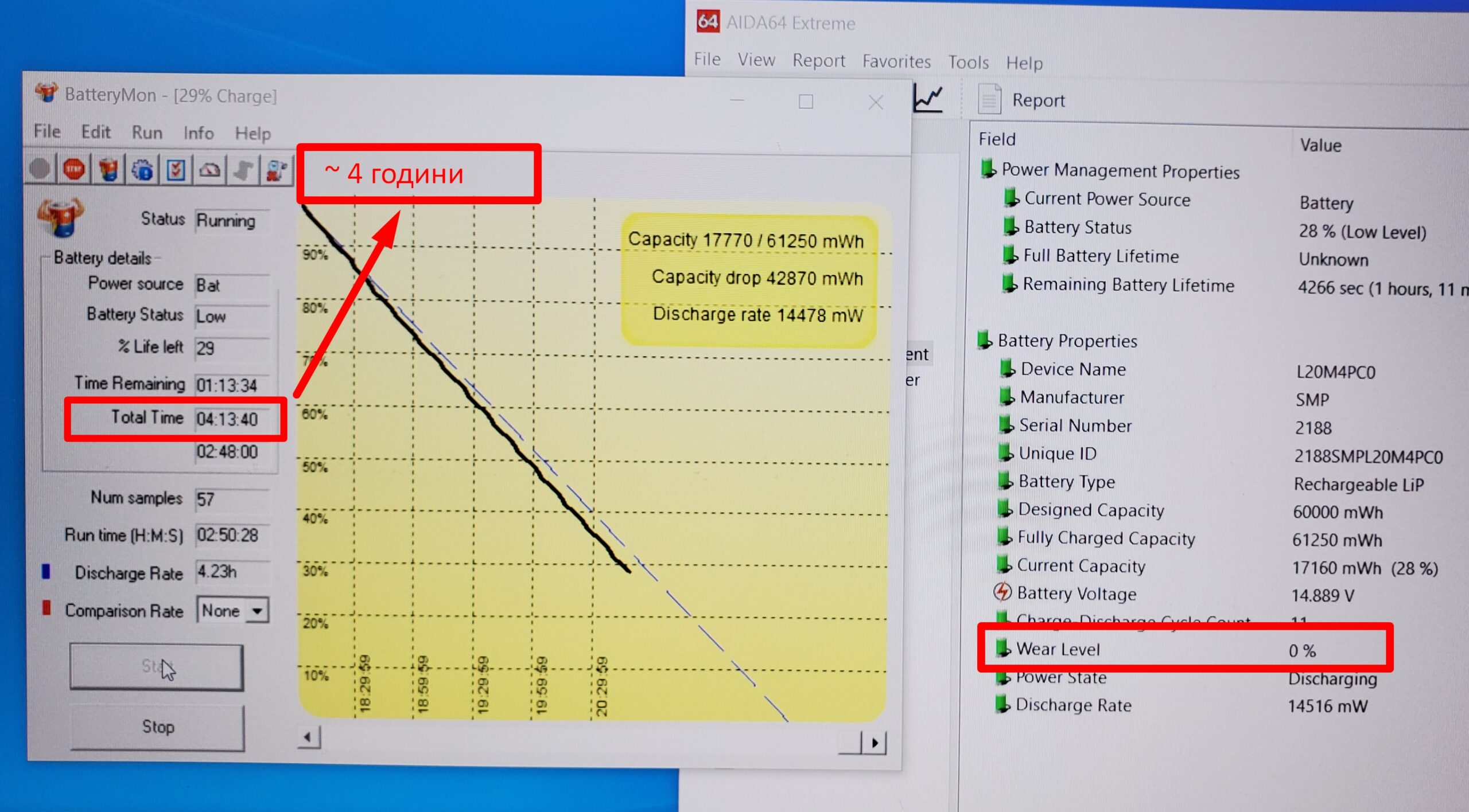 В продаже очень удачная современная модель Legion 5 15ACH6H ноутбука от Lenovo в хорошем состоянии с небольшими следами использования на мощном полноценном процессоре AMD Ryzen 7 5800H со временем работы от аккумулятора около 4 часов в режиме просмотра фильма (см. скриншот).