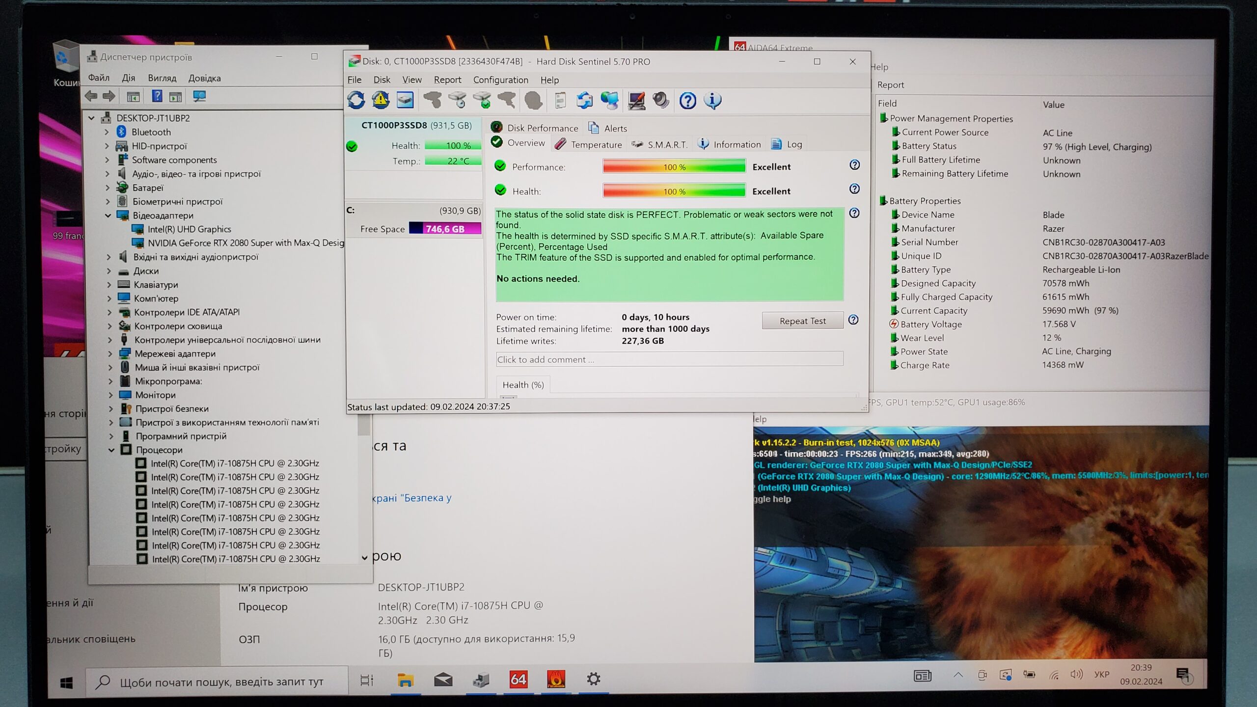 Более чем удобный для работы 16Gb объем оперативной памяти DDR4 (8+8Gb еще и в двухканальном режиме +15% производительности) и новый диск SSD m2 NVMe Crusial на 1Tb с самым быстрым интерфейсом PCI Express.
