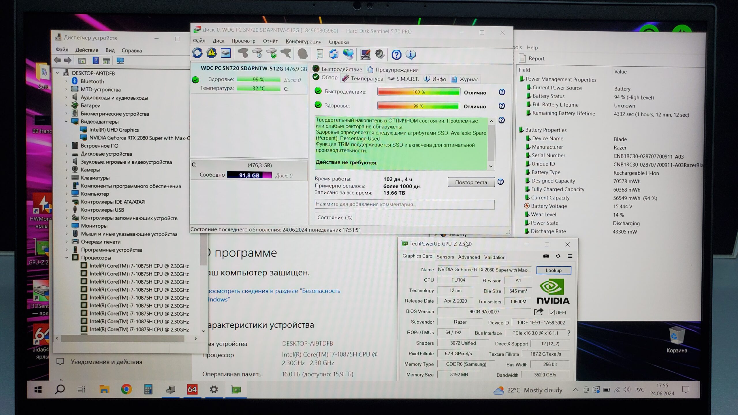 • Видеокарта: nVidia GeForce RTX 2080 SUPER 8Gb GDDR6 (актуальная, сверхмощная)
