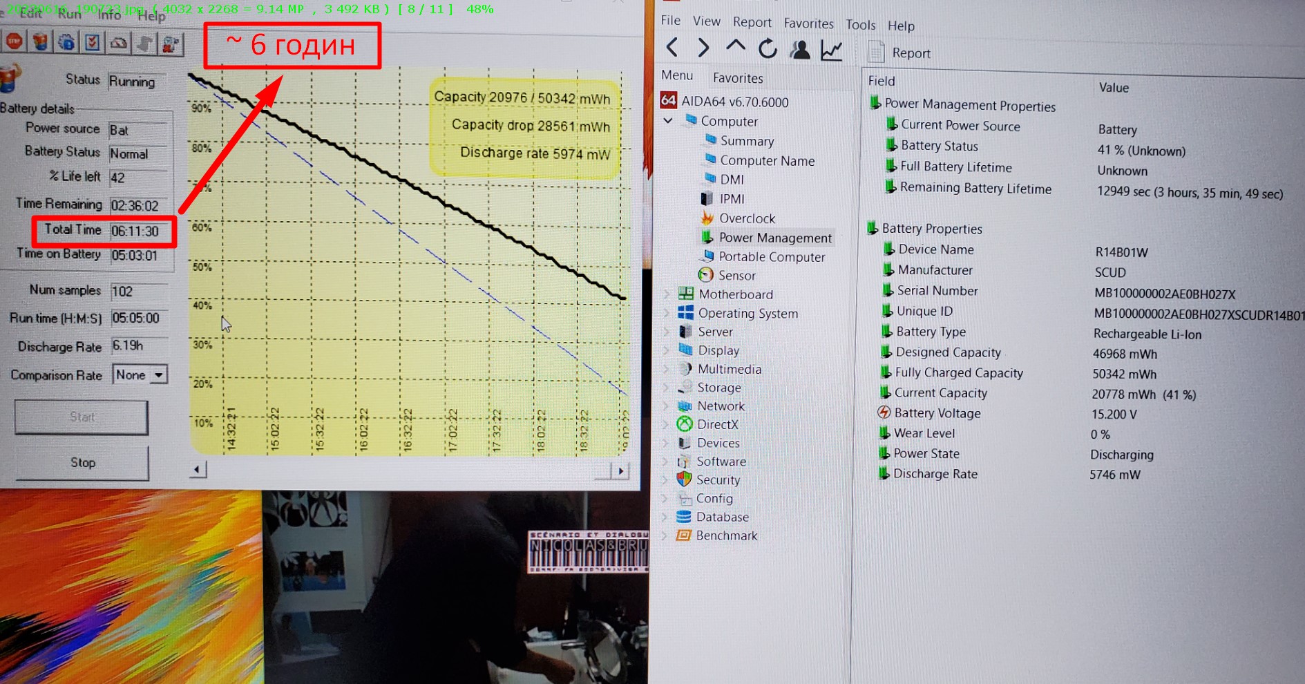 Судя по тестам должно работать более 6 часов в режиме просмотра фильмов! Точные цифры будут на скриншоте (см. фото)