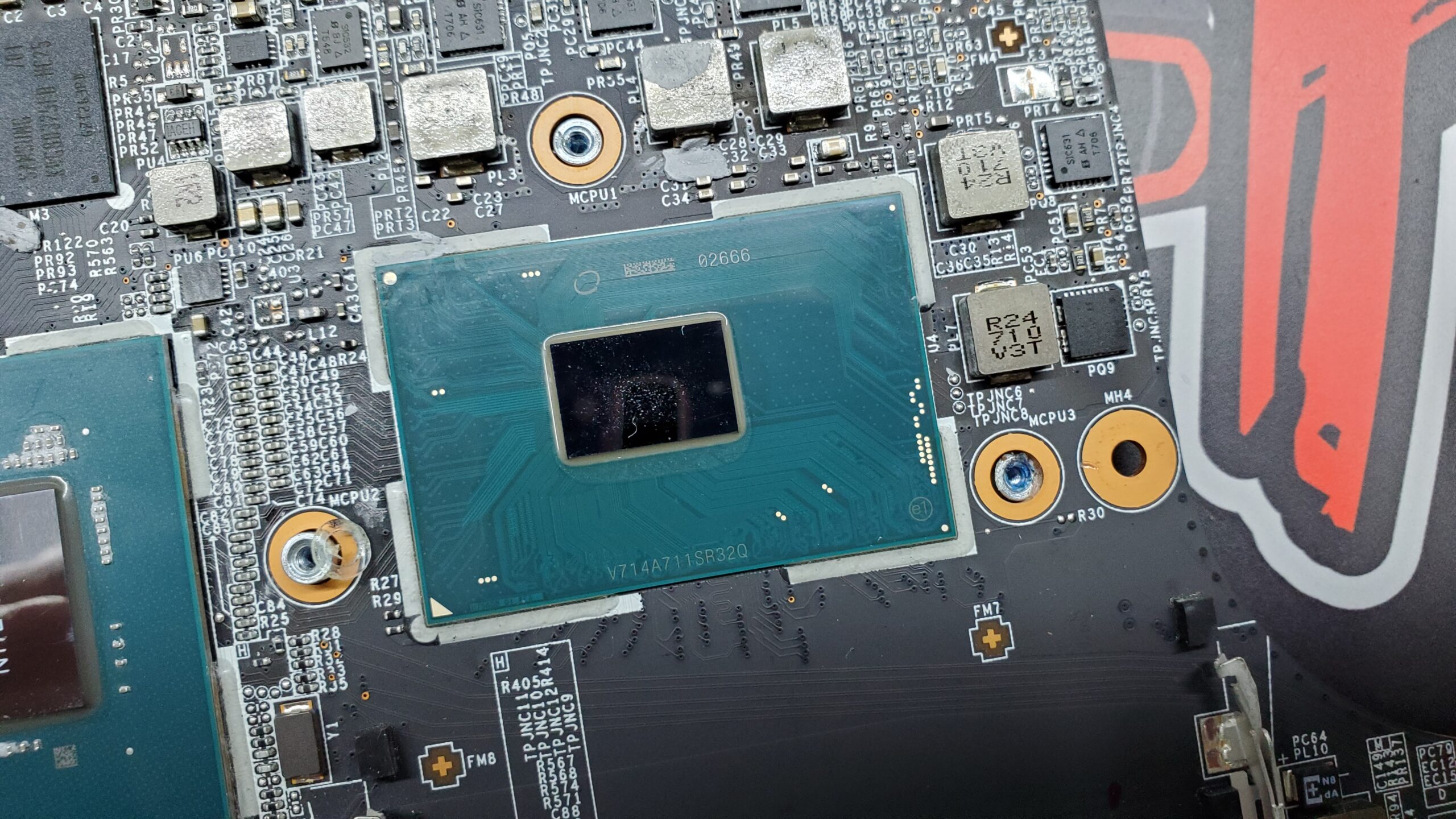 В отдельных случаях, когда «пробивает» источник питания процессора (например, из-за залития) кроме ремонта источника питания требуется еще и замена процессора i7-7700HQ (SR32Q).