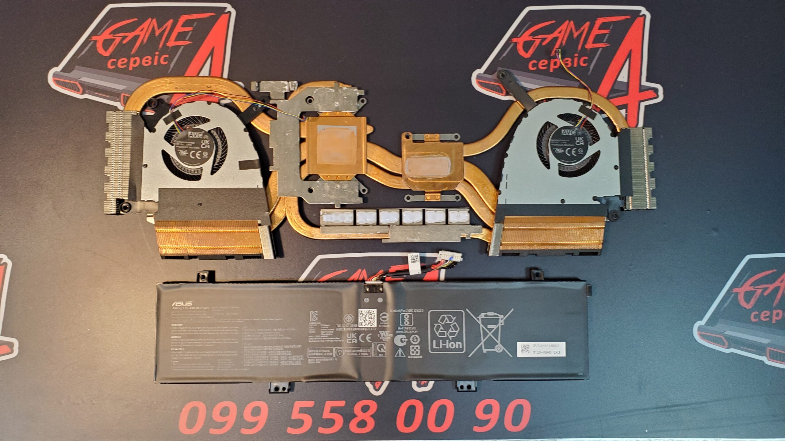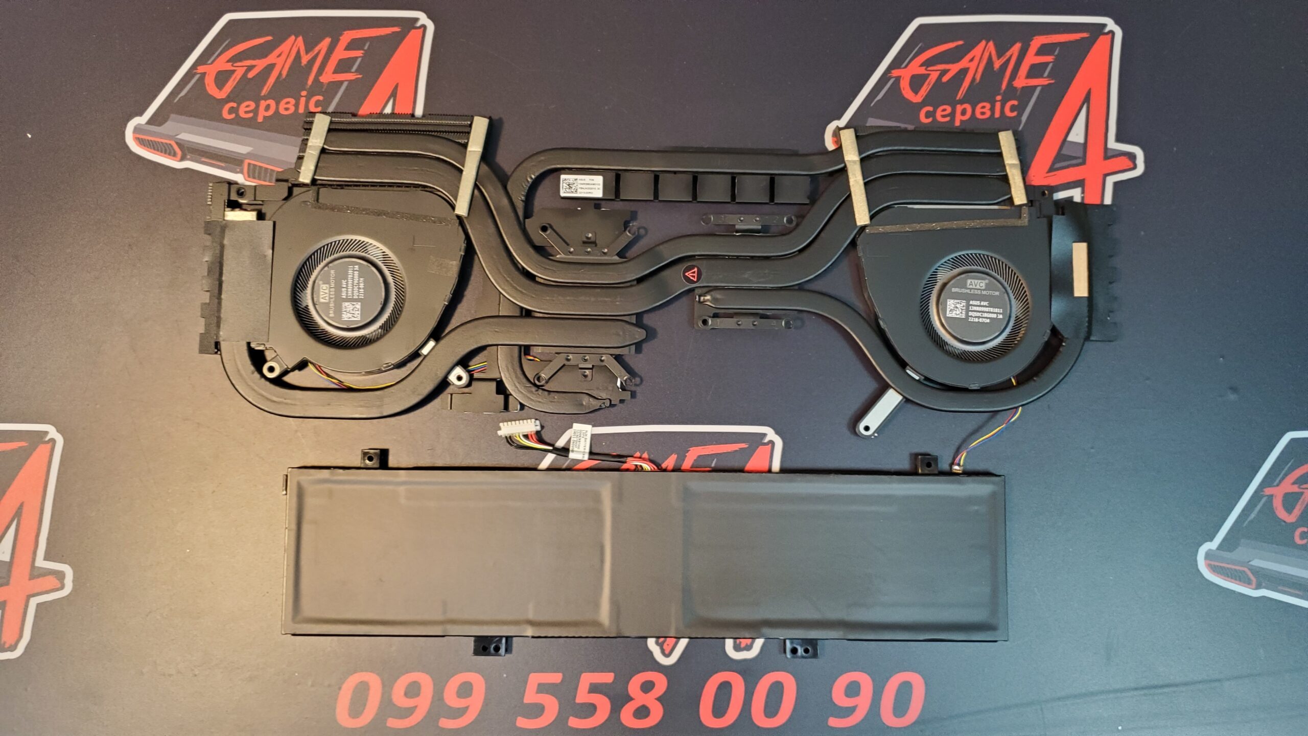 5 и 6 фото) Система охлаждения ASUS TUF FX517ZR (Intel 12gen + RTX 3070Ti), кулер CPU ASUS TUF FX517ZR и кулер GPU ASUS TUF FX517ZR, батарея ASUS TUF FX517ZR.